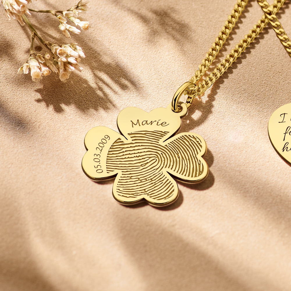 Fingerabdruck Anhänger Glücksbringer aus Gold Personalisieren Sie Ihren SchmuckFingerabdruck Anhänger Glücksbringer aus GoldProduktnummer:GHEV010Preis: € 404,00 1 Bild hochladen* 2 Name: (Bis zu 10 Zeichen)* 3 Datum: (Maximal 10 Zeichen)* 4 Kette wählen* Ohne Kette 45-50cm - Goldene Kette Jasseron 45-50cm Goldene Anker Kette 45-50cm - Goldene Venezianische Kette 45-50cm - Goldene Gourmet Kette 38-42cm (Kind) - Goldene Kette Jasseron 38-42cm (Kind) Goldene Anker Kette 38-42cm (Kind) - Goldene Venezianischen Kette 38-42cm (Kind) - Goldene Gourmet Kette Möchten Sie einen Rückseitengravur?* Nein Ja (+ 15,00 €) 5 Name: (Bis zu 12 Zeichen)* Tragen Sie hier eventuelle Bemerkungen ein: In den Warenkorb Kostenloser VersandSchnelle Lieferung Auch lieferbar in: 925 Silber Produktinformation:Fingerabdruck Anhänger Glücksbringer aus GoldProduktnummer:GHEV010Preis: € 404,00 14 karätiger Gold Fingerabdruck Anhänger Glücksbringer mit Namen und Datum. Ein schöner goldene Gedenkanhänger gravieren wir nicht nur Ihren eingereichten Fingerabdruck ein sondern auch Ihre gewünschten Namen und Datum. Ein sehr persönliches Geschenk, da jeder Fingerabdruck einzigartig ist. Dieser goldene Glücksbringer mit Namen und Datum ist ein Symbol für die besondere Beziehung mit dem verstorbenen geliebten und kann ein Trost sein nach dem Verlust eines verstorbenen. Der goldene Kleeblatt mit Fingerabdruck, Namen und Datum hat eine Größe von ca. 21 x 22 mm und ist 0,4 mm dick ist. Passende Goldketten sind separat in unserem Web Shop erhältlich. Newsletter - 10% Willkommensrabatt sichern!Erhalten Sie alle neusten Infos & Deals von NamesforeverEmailadresse:Vorname:Geburtsdatum: