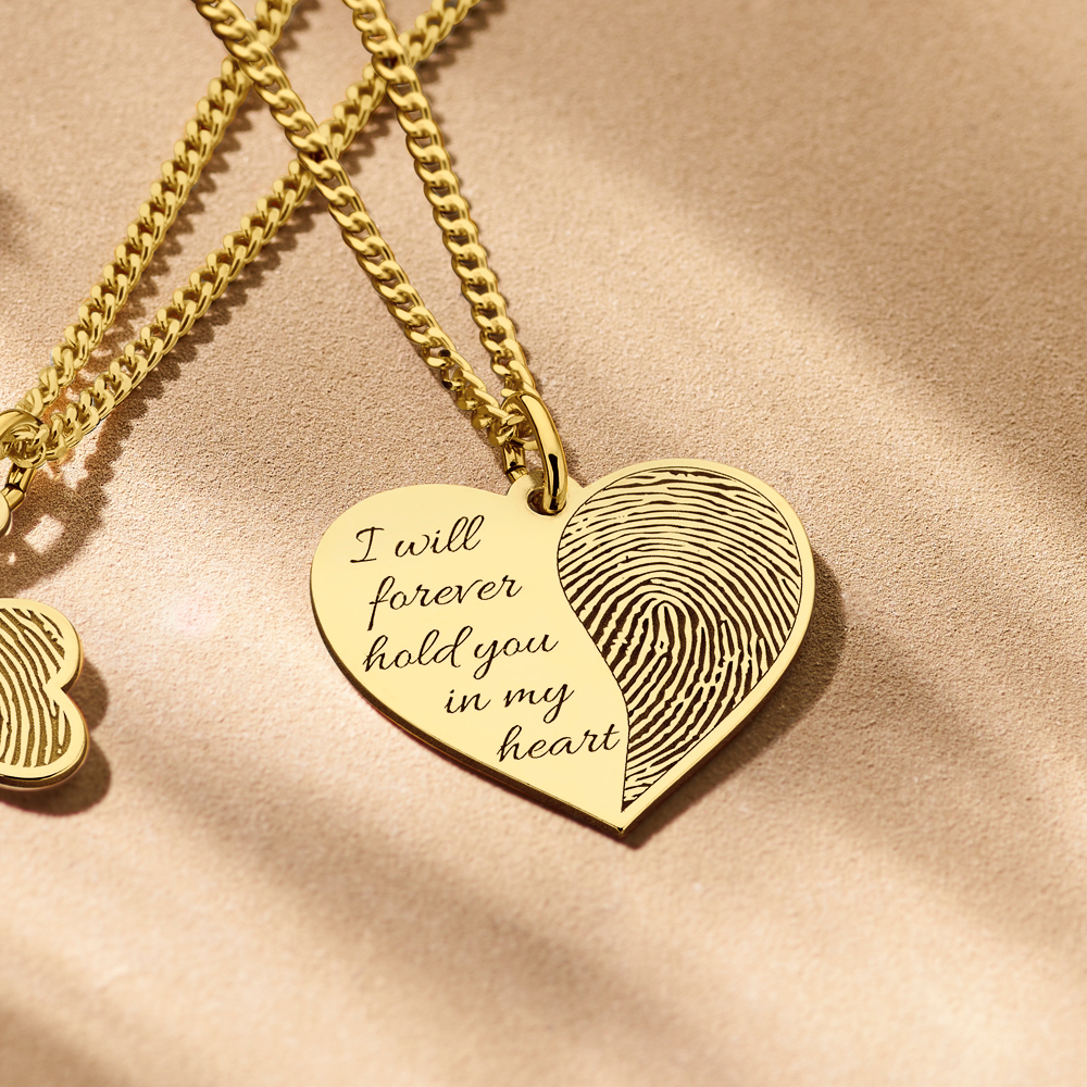 Goldener Fingerabdruck Schmuck in Herzform Personalisieren Sie Ihren SchmuckGoldener Fingerabdruck Schmuck in HerzformProduktnummer:GHEV041Preis: € 409,00 € 368,10 Productsheet:Download 1 Bild hochladen* 2 1. Zeile: (Bis zu 10 Zeichen)* 3 2. Zeile: (Bis zu 10 Zeichen)* 4 3. Zeile: (Bis zu 10 Zeichen)* 5 4. Zeile: (Bis zu 10 Zeichen)* 6 5. Zeile: (Bis zu 8 Zeichen)* 7 Kette wählen* Ohne Kette 45-50cm - Goldene Kette Jasseron 45-50cm Goldene Anker Kette 45-50cm - Goldene Venezianische Kette 45-50cm - Goldene Gourmet Kette 38-42cm (Kind) - Goldene Kette Jasseron 38-42cm (Kind) Goldene Anker Kette 38-42cm (Kind) - Goldene Venezianischen Kette 38-42cm (Kind) - Goldene Gourmet Kette Möchten Sie einen Rückseitengravur?* Nein Ja (+ 15,00 €) 8 Tekst: (Bis zu 30 Zeichen)* Tragen Sie hier eventuelle Bemerkungen ein: In den Warenkorb Kostenloser VersandSchnelle Lieferung Auch lieferbar in: 925 Silber Produktinformation:Goldener Fingerabdruck Schmuck in HerzformProduktnummer:GHEV041Preis: € 409,00 € 368,10 Beschreibung Ein wunderschöner Fingerabdruck Anhänger in Herzform mit zwei Hälften. Die eine Hälfte mit einem von Ihnen ausgewählten Text und auf der anderen Hälfte ein Fingerabdruck. Möchten Sie das Schmuckstück verschenken? Kein Problem! Das Schmuckstück wird in einer schönen Geschenkdose geliefert. Eigenschaften Material 14 Karat Gold Gravur Fingerabdruck + 4 x 10 & 1 x 8 Zeichen Größe Anhänger 19,5 x 22 mm Stärke 0,4 mm Kundenservice Möchten Sie etwas anpassen? Mailen Sie oder rufen Sie unseren Kundenservice an unter + 49 2182 6990877 oder info@namesforever.de. Standardversand dauert 10-12 Werktage, Expressversand (+ 4,95€) 5-6 Werktage. * Bitte beachten: Da dieser Schmuck speziell für Sie angefertigt wird, kann dieser nicht umgetauscht oder zurückgegeben werden. Newsletter - 10% Willkommensrabatt sichern!Erhalten Sie alle neusten Infos & Deals von NamesforeverEmailadresse:Vorname:Geburtsdatum:
