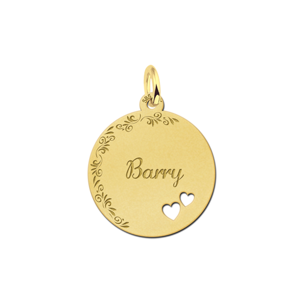 Der Runde Anhänger aus 14 Karat Gold hat einen Durchmesser von 19mm. Der Anhänger hat einen gravierten Namen und eine Verzierung am Rand. Auch hat der Anhänger einen Auslass in der Form von zwei kleine Herzchen. Der gewünschte Name wird in zierlichen Buchstaben in das Silberne Plättchen graviert. Bestellen Sie die passende Kette gleich mit! Ihr Kettenanhänger aus Gold wird in einem hübschen Schmuckkästchen verpackt. Der Versand erfolgt kostenlos, unabhängig vom Bestellwert!