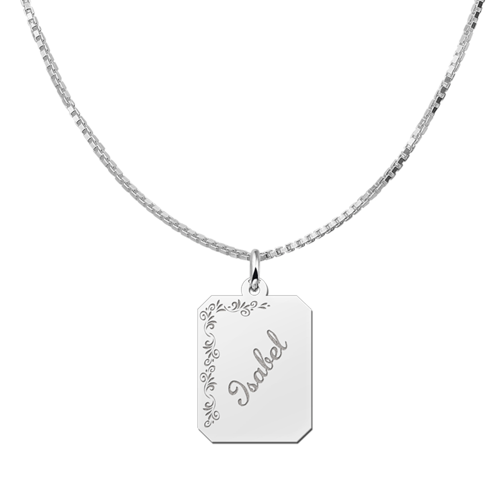Das 8-seitige silberen Gravurplättchen ist ca. 16 x 20 mm groß und mit einer eleganten Blumengravur versehen. Auf dem Gravurplättchen wird natürlich der Name Ihrer Wahl eingraviert. Der Name wird in hübscher Schrift graviert. Bestellen Sie die passende Kette gleich mit! Schnelle Gratislieferung!